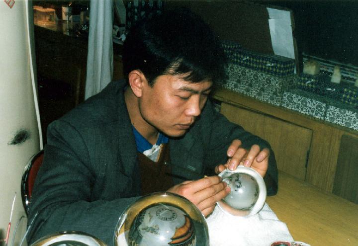 artist1 This artist was working at the Forbidden City. He's painting on a sphere that is inside of a crystal sphere, painting through a tiny hole that will later be covered by the base. |